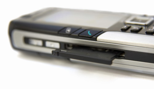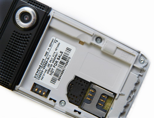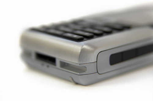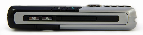 На левом боку аппарата расположены кнопки активации видеозвонка, вызова медиаплеера и слот для карты памяти. Конструкция держателя не совсем обычна – карту приходится вставлять в перевернутом виде. При извлечении ее из телефона приходится следить, чтобы карта не упала на землю. Формат карты – RS MMC, но не Dual Voltage, а обычный с напряжением 3.3 В. Карты формата RS MMC Dual Voltage телефон не распознает. Максимальный объем поддерживаемых карт составляет 1 Гб. На правой боковой грани расположены две кнопки регулировки громкости и окошко ИК-порта. В нижней части аппарата находится коммуникационный разъем. В верхней части задней панели располагается разъем для подключения внешней антенны. Средняя зона закрыта перфорированной пластиковой решеткой. Под ней расположены стереофонические динамики, создающие объемный и насыщенный звук. В ее правой части находится объектив 2-х мегапиксельной камеры. Нижняя секция панели серебристо-белого цвета. Она прикрывает аккумуляторный блок.